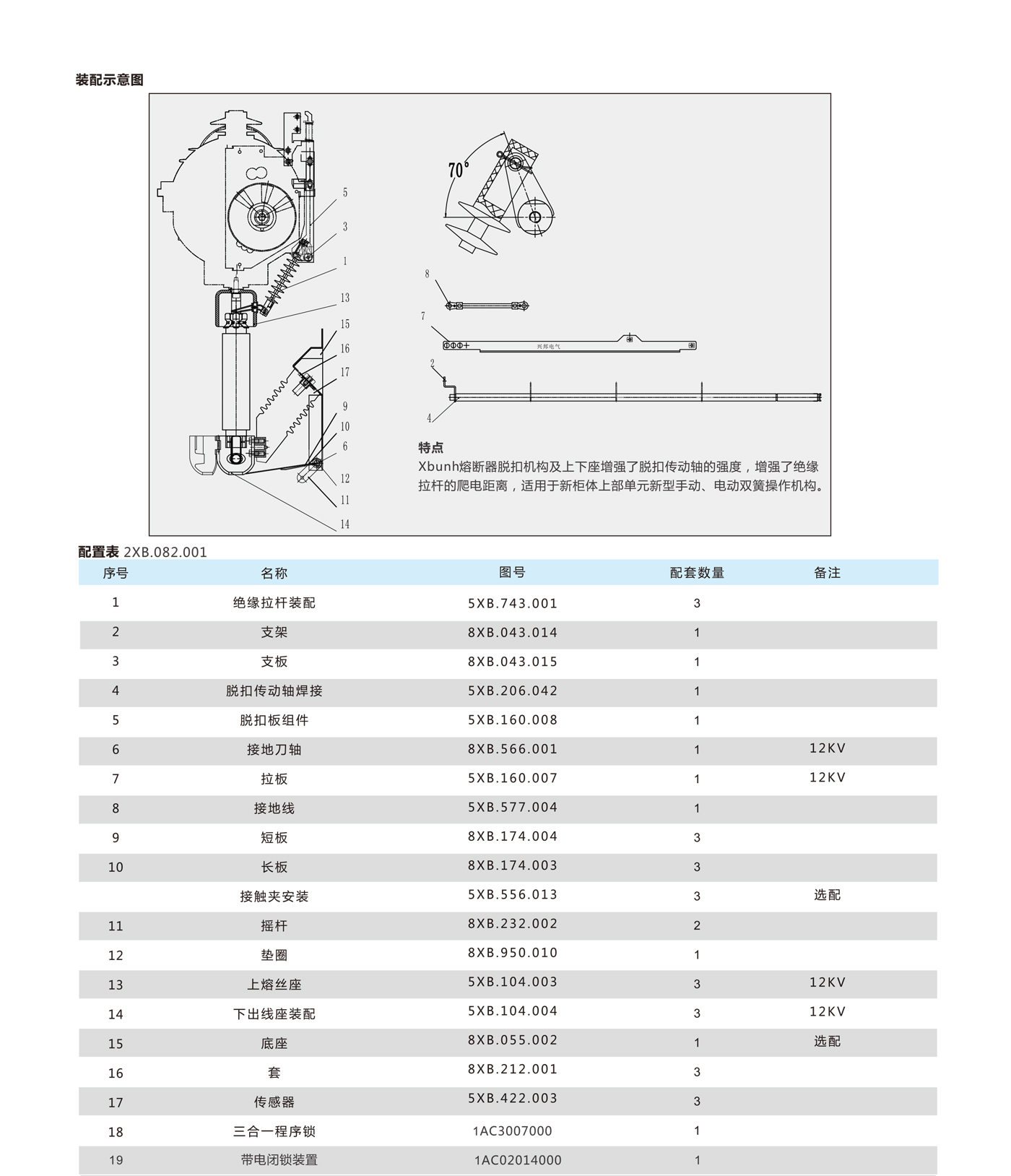 Xbunh熔断器脱扣机构及上下座增强了脱扣传动轴的强度,增强了绝缘拉杆的爬电距离,适用于新柜体上部单元新型手动、电动双簧操作机构。