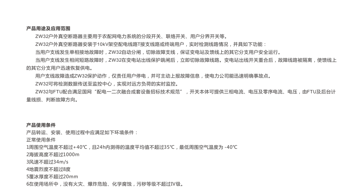 ZW32户外交流高压真空断路器是共箱式柱上开关产品。弹簧操作机构,置保护CT和零序CT,配合看门狗控制器可以实现线路分界.可作为城网与农网电力系统的分段开关、联络开关、用户分界开关,与分界开关控制器配合,应用于10kV架空线路可大大减少故障线路的连带性停电事故、绌小故障停电范围、缩短用户停电时间,从而提高用户的供电可富性.满足IEC62271-100、GB1984、GB/T11022、DL/T403等标准要求